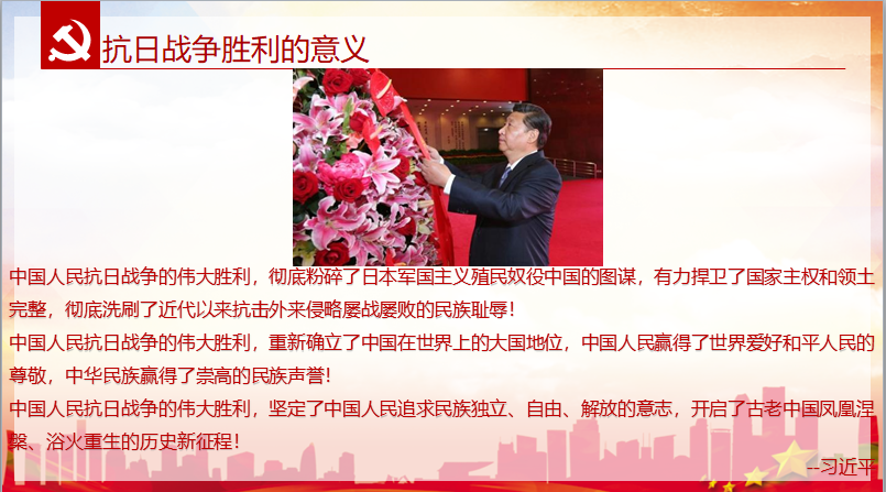学习抗战历史,传承抗战精神。杜逢涣同志首先带领支部成员回顾了习近平总书记在纪念中国人民抗日战争暨世界反法西斯战争胜利75周年座谈会上的重要讲话,总书记指出,中国人民抗日战争伟大胜利的重要意义在于它粉碎了日本军国主义殖民奴役中国的图谋,重新确立了中国在世界上的大国地位,坚定了中国人民追求民族独立、自由、解放的意志,开启了古老中国凤凰涅槃、浴火重生的历史新征程。之后,支部成员共同学习了董存瑞、杨靖宇、张自忠等抗日战争时期国共两党涌现的抗战英雄及其英勇事迹,在深受鼓舞的同时更加深刻体会到当下和平的来之不易。