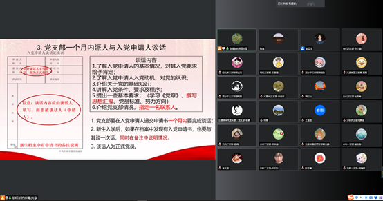 专职组织员张娅彭就党员发展工作中的工作流程、注意事项、关键环节、材料填写细节和最新要求进行了梳理和讲解,希望党员骨干加强理论学习,按照“控制总量、优化结构、提高质量、发挥作用”的总要求,始终把政治标准放在首位,严格履行发展党员工作程序,要着力把符合党员条件的先进分子和优秀人才吸收到党内来,不断提高发展老员工党员质量,增强党组织的生机与活力,夯实党执政的组织基础。