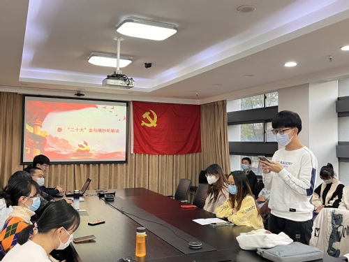 分析科学研究中心研究生第四党支部成员卢莎、林雯月、齐放、贺中达分别进行了二十大金句摘抄分享。参会党员认真学习、积极研讨,立足自身,畅谈学习感悟。分析科学研究中心研究生第四党支部党员周静会说:“学习好二十大报告,领悟党的二十大精神,我们应在民族复兴的赛道上奋勇争先、披荆斩棘,做有理想、敢担当、能吃苦、肯奋斗的新时代好青年。”