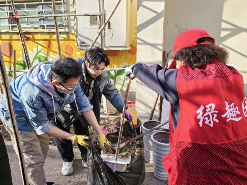 之后,支部党员与现场志愿者一起开展了零废弃社区“绿趣园春耕志愿服务行动”。现场“兵分三路”,分头进行春耕翻地及厨余堆肥、最美弯腰、社区花园营造专项行动。志愿者们拿起捡拾袋和捡拾夹,将社区花园中的烟头、纸屑、废木、瓶盖、塑料瓶等垃圾进行捡拾,分类打扫社区卫生,翻新土地,装饰围栏,整理花盆,用实际行动使更多居民认识到垃圾分类的重要性并带动更多人投身于社区环境保护工作中。而青年党员们也在劳动实践中彰显青春担当,在责任与奉献中践行初心与使命,培养了勤俭、奋斗、创新、奉献的劳动精神。