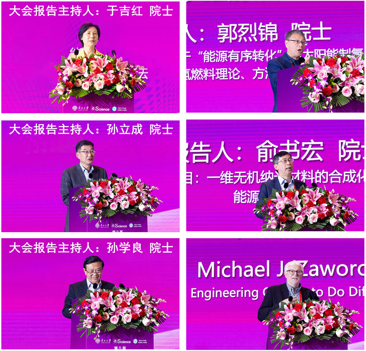 本次会议邀请了包信和院士、鄂维南院士、俞大鹏院士、郭烈锦院士、俞书宏院士和Michael John Zaworotko院士带来了6场精彩的大会报告,冯守华院士、张涛院士、李亚栋院士、于吉红院士、孙立成院士和孙学良院士依次主持大会报告。包信和院士报告主题为“From: Molecular Design to Carbon-Neutral Applications: Opportunities and Challenges in Energy Materials Chemistry”,围绕分子设计到碳中和应用以及所遇到的挑战进行深入探讨;鄂维南院士报告主题为“人工智能赋能的分子设计”,围绕人工智能的前沿趋势、实际应用场景和发展机遇进行分享;俞大鹏院士报告主题为“万物皆可量子——量子计算 人人有责”,围绕发展量子技术的必然性,量子力学史及其带来的相关问题进行介绍;郭烈锦院士报告主题为“基于“能源有序转化”的太阳能制氢制碳氢燃料理论、方法与技术”,围绕能源现状及其科技与产业的重要性进行详细分析;俞书宏院士报告主题为“一维无机纳米材料的合成化学及其能源转化性能”,围绕功能导向的一维纳米材料的精准构筑及其在光电转换器件和智能变色等方向的广阔应用前景进行介绍;Michael John Zaworotko院士报告主题为“Engineering crystals to do different things”,围绕晶体材料设计的背景、原则及其在能源气体的分离纯化和储存等方面的应用进行分享。