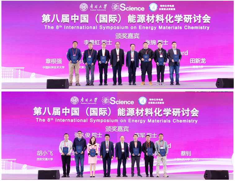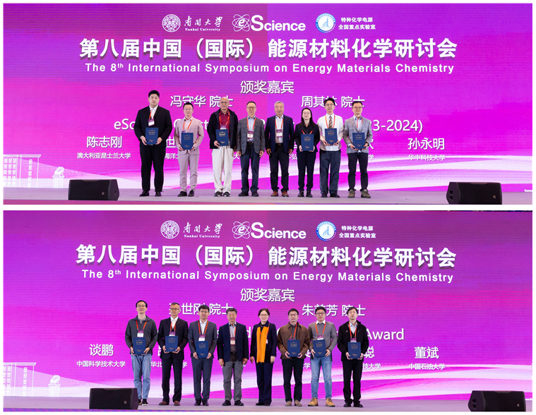 青岛科技大学吴则星教授、中国石油大学董斌教授、中国科学技术大学谈鹏教授、温州大学李林教授、中国科学技术大学章根强教授、中南大学方国赵教授、电子科技大学樊聪教授、武汉理工大学徐林教授、天津大学杨永安教授、温州大学肖遥教授、海南大学田新龙教授、华北电力大学吕玮教授获eScience突出贡献奖,孙世刚院士、朱美芳院士、李景虹院士和张锦院士为12位获奖者颁奖。