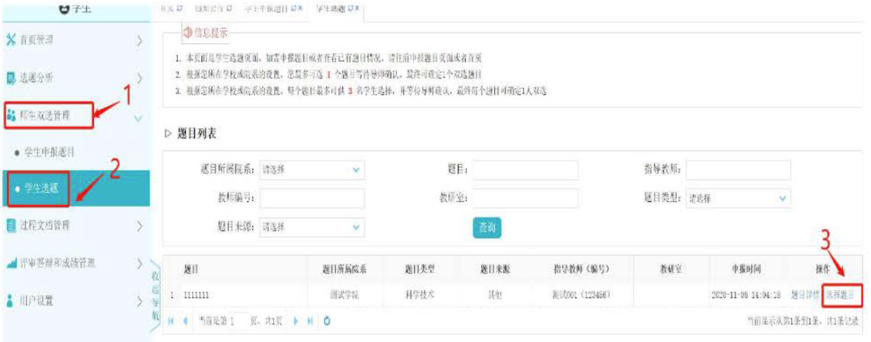 如下图点击菜单栏左侧的“师生双选管理”后再点击“员工选题"'