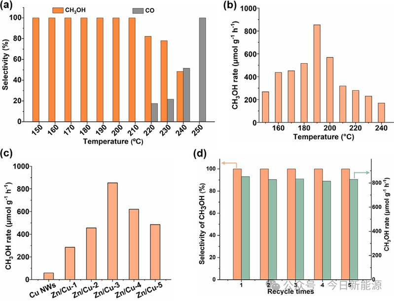 图3 | Zn/Cu SAAs的催化性能。(a) Zn/Cu SAAs(Zn/Cu-3)上CO₂加氢制甲醇的CH₃OH选择性(H₂/CO₂=3:1,3.0MPa)。(b) Zn/Cu-3在不同温度下的CH₃OH产率。(c) 在最优反应条件下(H₂/CO₂=3:1,3.0MPa,190°C)不同催化剂上的CH₃OH产率。(d) Zn/Cu-3催化剂的循环稳定性。