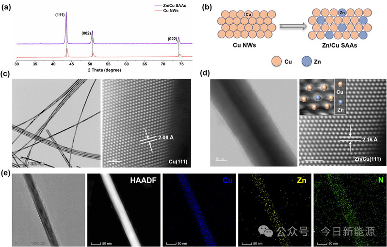图1 | Zn/Cu SAAs催化剂的结构表征。(a) Cu NWs和Zn/Cu SAAs的XRD图谱。(b) Zn掺杂引起Cu晶格膨胀的示意图。(c) Cu NWs和(d) Zn/Cu SAAs的TEM图像和原子分辨率HAADF-STEM图像,显示Zn掺杂引起的Cu晶格膨胀。(e) Zn/Cu SAAs的TEM元素分布图。