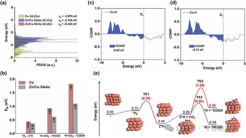 图4 | CO₂在Zn/Cu SAAs上加氢制甲醇的反应机理。(a) 计算的Cu(111)和Zn/Cu(111)的Cu 3d态密度。(b) 不同基元反应中的活化能。(c) Cu(111)和(d) Zn/Cu(111)模型催化剂上吸附*H的Cu─H键强度的积分晶体轨道哈密顿布居数。(e) Zn/Cu SAAs上CH₃OH合成的能量图。