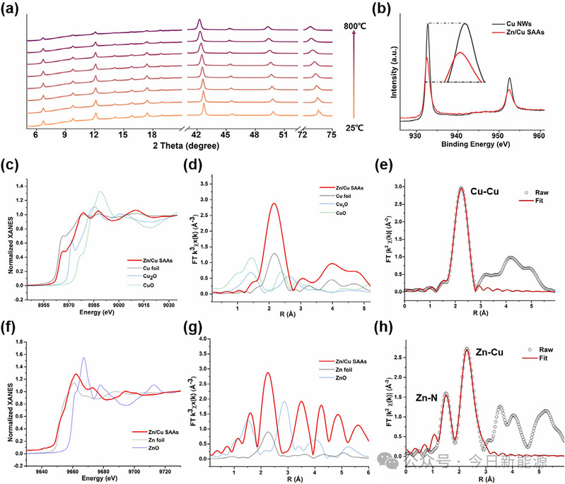 图2 | Zn/Cu SAAs的精细结构表征。(a) Cu NWs@ZIF-8在Ar气氛下从25到800°C的原位XRD图谱。(b) Cu NWs和Zn/Cu SAAs的Cu 2p XPS谱图,插图为Cu 2p3/2的放大视图。(c) 以Cu箔/Cu₂O/CuO为参照的Zn/Cu SAAs的Cu K边XANES谱图。(d) R空间中的k³加权Cu K边傅里叶变换EXAFS谱图。(e) Zn/Cu SAAs在R空间中的Cu K边EXAFS拟合曲线。(f) 以Zn箔/ZnO为参照的Zn/Cu SAAs的Zn K边XANES谱图。(g) R空间中的k³加权Zn K边傅里叶变换EXAFS谱图。(h) Zn/Cu SAAs在R空间中的Zn K边EXAFS拟合曲线。
